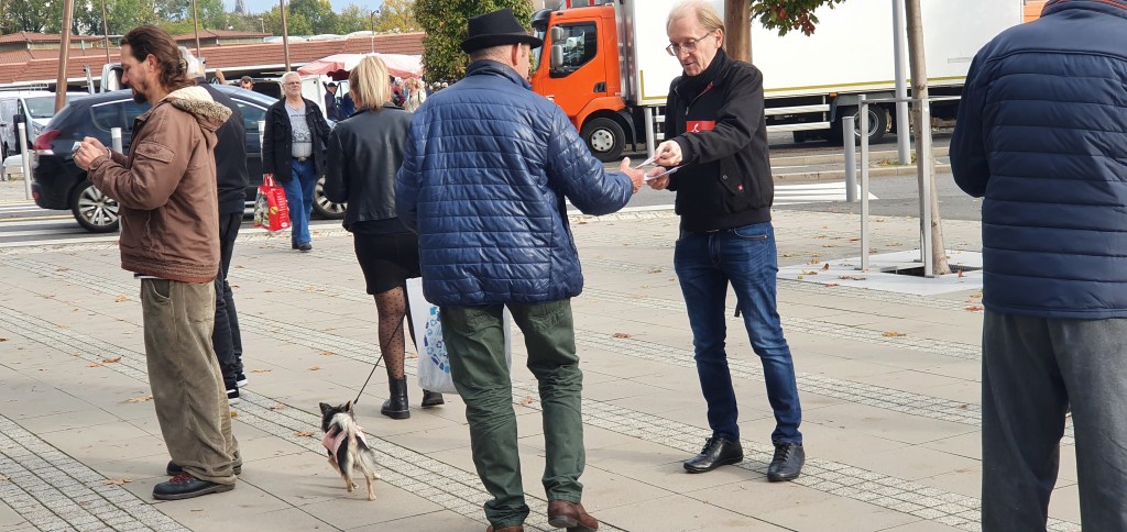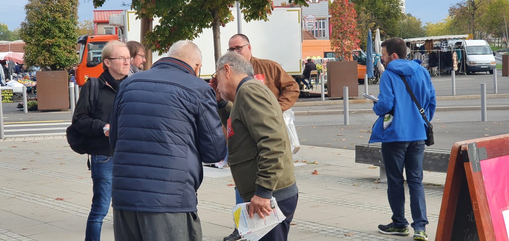 Ce matin, au marché de Vandoeuvre, j’ai participé à la distribution de tracts par la section de Nancy du Parti Communiste contre la vie chère, pour l’augmentation des salaires, le retour de la retraite à 60 ans et pour inciter à la participation à la manifestation du 27 octobre.