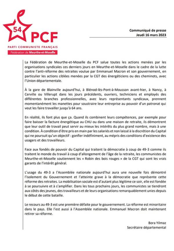 Déclaration de Fabien Roussel - Retraites : le combat continue ! Construisons une autre majorité politique ! À neuf voix près, la motion de censure n’a pas été adoptée. Quel naufrage pour le gouvernement ! Cette réforme reste illégitime. Le combat continue car une majorité de progrès existe toujours dans notre pays contre cette réforme. Depuis... Lire la Suite →